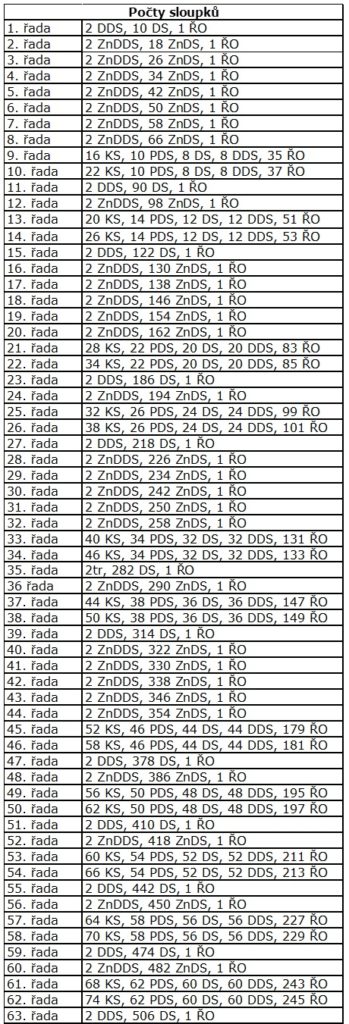 - řada: 2 ŘO (počítají se jako první PDS), 2 KS do prvního sloupku, [ ŘO, přeskočíme 1 sloupek, KS, ŘO, přeskočíme 1 sloupek, PDS, ŘO, přeskočíme 1 sloupek, DS, ŘO, přeskočíme 1 sloupek, DDS, ŘO, přeskočíme 1 sloupek, DDS, ŘO, přeskočíme 1 sloupek, DS, ŘO, přeskočíme 1 sloupek, PDS, ŘO, přeskočíme 1 sloupek, KS] znovu zopakujeme, ŘO, přeskočíme 1 sloupek, (2 KS, ŘO, 2 KS) do otvoru pod ŘO, [ŘO, přeskočíme 1 sloupek, KS, ŘO, přeskočíme 1 sloupek, PDS, ŘO, přeskočíme 1 sloupek, DS, ŘO, přeskočíme 1 sloupek, DDS, ŘO, přeskočíme 1 sloupek, DDS, ŘO, přeskočíme 1 sloupek, DS, ŘO, přeskočíme 1 sloupek, PDS, ŘO, přeskočíme 1 sloupek, KS] znovu zopakujeme, ŘO, přeskočíme 1 sloupek, (2 KS, 1 PDS) do posledního sloupku. Otočte. (16 KS, 10 PDS, 8 DS, 8 DDS, 35 ŘO)
