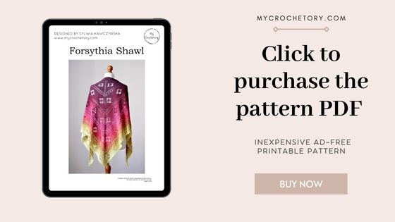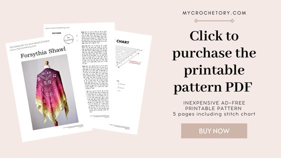 Scroll down to see the FREE Forsythia Prayer Crochet Shawl pattern or you may choose to purchase the ad-free, printable PDF crochet pattern with crochet stitch chart HERE on ETSY or HERE on Ravelry.