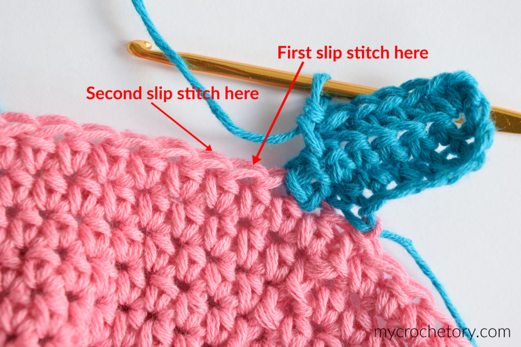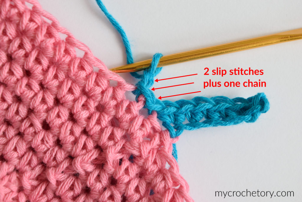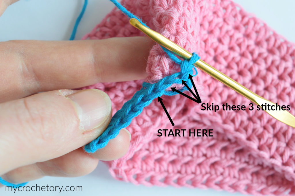 Row 1: starting with 2nd chain from hook, work 1 sc in each ch back to edge of your project. Join to the next st of the edge of your project using sl st and work one more sl st in the next st of your project (2 sl sts in total for joining) plus make ch1. Turn.