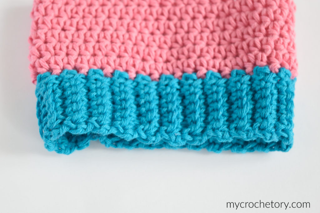 After working the last row of the main body, you will be adding the ribbed edge onto your project. So don’t break the yarn and simply continue working the ribbing, unless you just want to change the color.