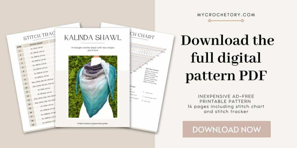 Scroll down to see the FREE Kalinda Triangular Shawl crochet pattern with VIDEO TUTORIAL or you may choose to purchase the complete ad-free, printable PDF crochet pattern with the stitch chart HERE on ETSY or HERE on Ravelry.