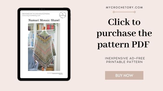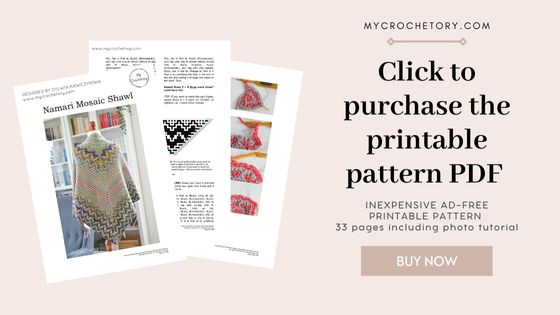 Scroll down to see the free Namari Mosaic Triangle Crochet Shawl pattern or you may choose to purchase the ad-free, printable PDF crochet pattern HERE on ETSY or HERE on Ravelry.