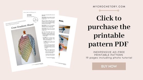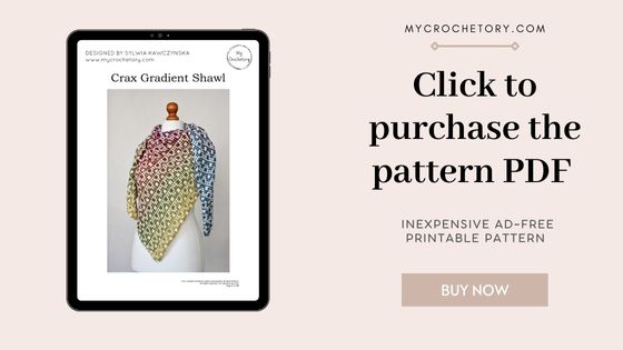 Scroll down to see the Crax Crochet Shawl with gradient yarn free pattern with step by step tutorial or you may choose to purchase the ad-free, printable PDF crochet pattern HERE on ETSY or HERE on Ravelry.