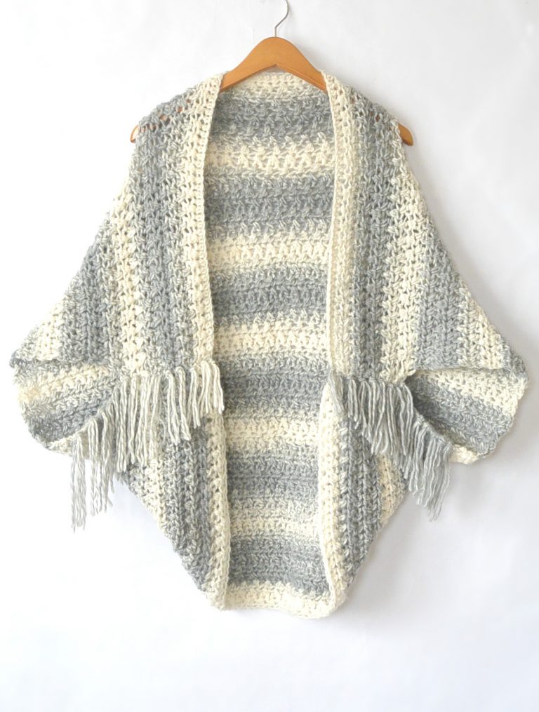 I love the fringe added to this beautiful crochet shrug. Don’t they look simply chic? Using only the basic crochet stitches and self striping yarn Jessica has achieved the unique effect.