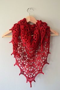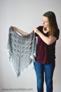 This wrap is a beautiful crescent shape that will drape around you like a breeze. I’m in love with the beautiful lacy stitches combine together!