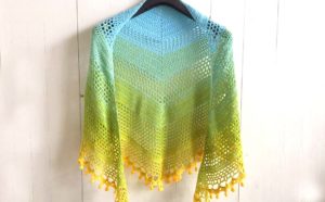 I love the lacy look and easy repeats of this shawl! It’s made with a gradient yarn and has a playful border with adorable little pom poms.