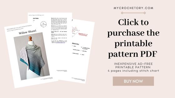 Scroll down to see the Willow Shawl free crochet pattern or you may choose to purchase the ad-free, printable PDF crochet pattern with the crochet stitch chart HERE on ETSY or HERE on Ravelry.