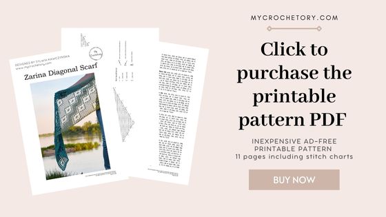 Scroll down to see the Part 1 of the FREE Zarina Diagonal Scarf crochet pattern or you may choose to purchase the COMPLETE ad-free, printable PDF crochet pattern with crochet stitch charts HERE on ETSY or HERE on Ravelry.